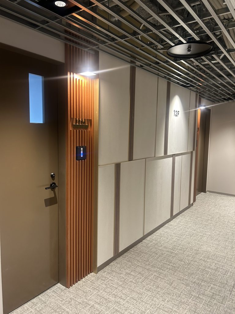 各フロア廊下になりますが、部屋前にサインパネルとEV前にはリブパネル(真鍮見切り)になります!